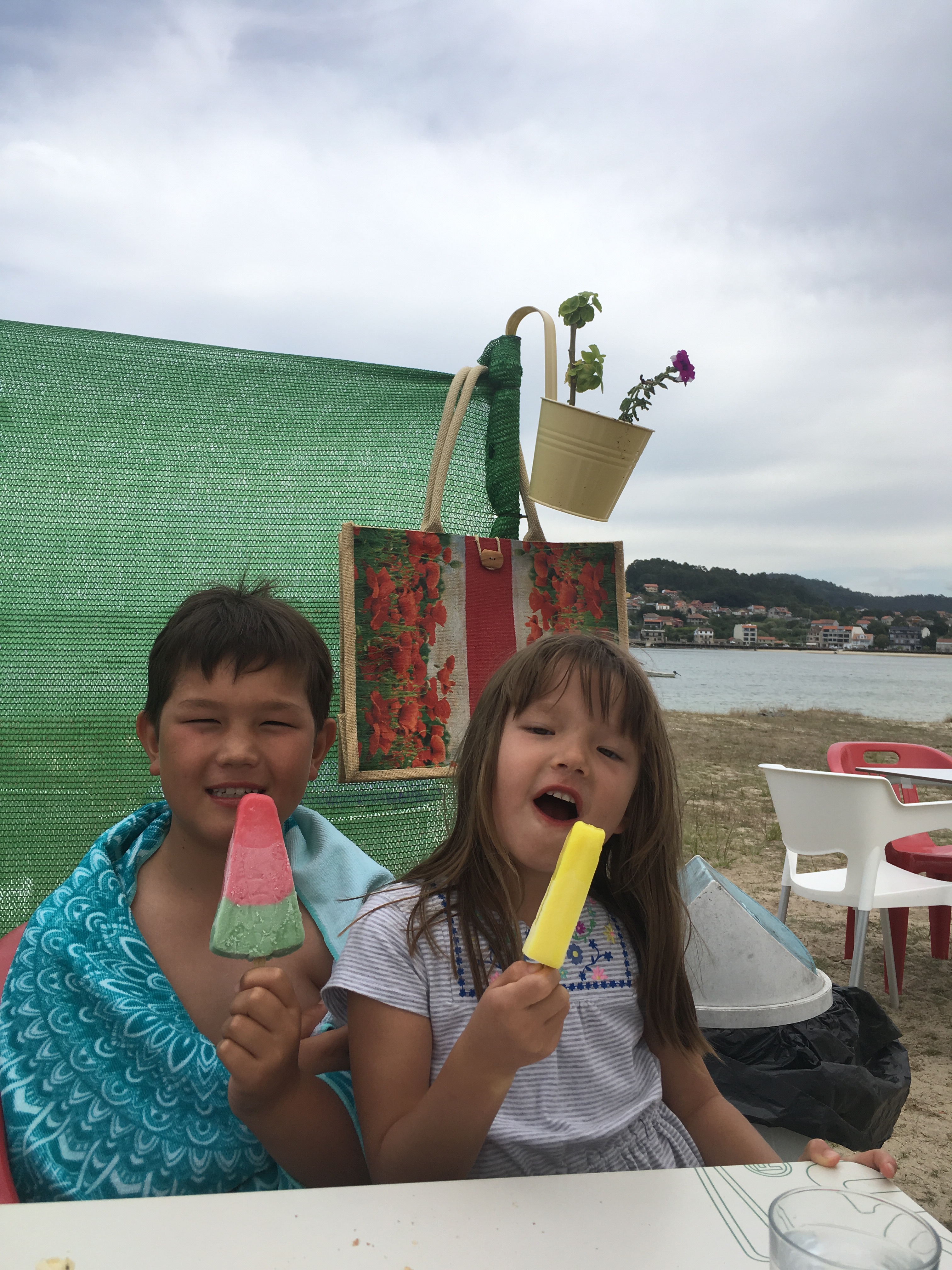 Today we found a quiet little beach that does not seem to have many foreign tourists. The beach is littered with beautiful seashells and there’s a small restaurant nearby. Perfect! The place where we are staying as a little terrier that lives next door and the kids have semi-adopted it. We got to take it on a walk to the beach.