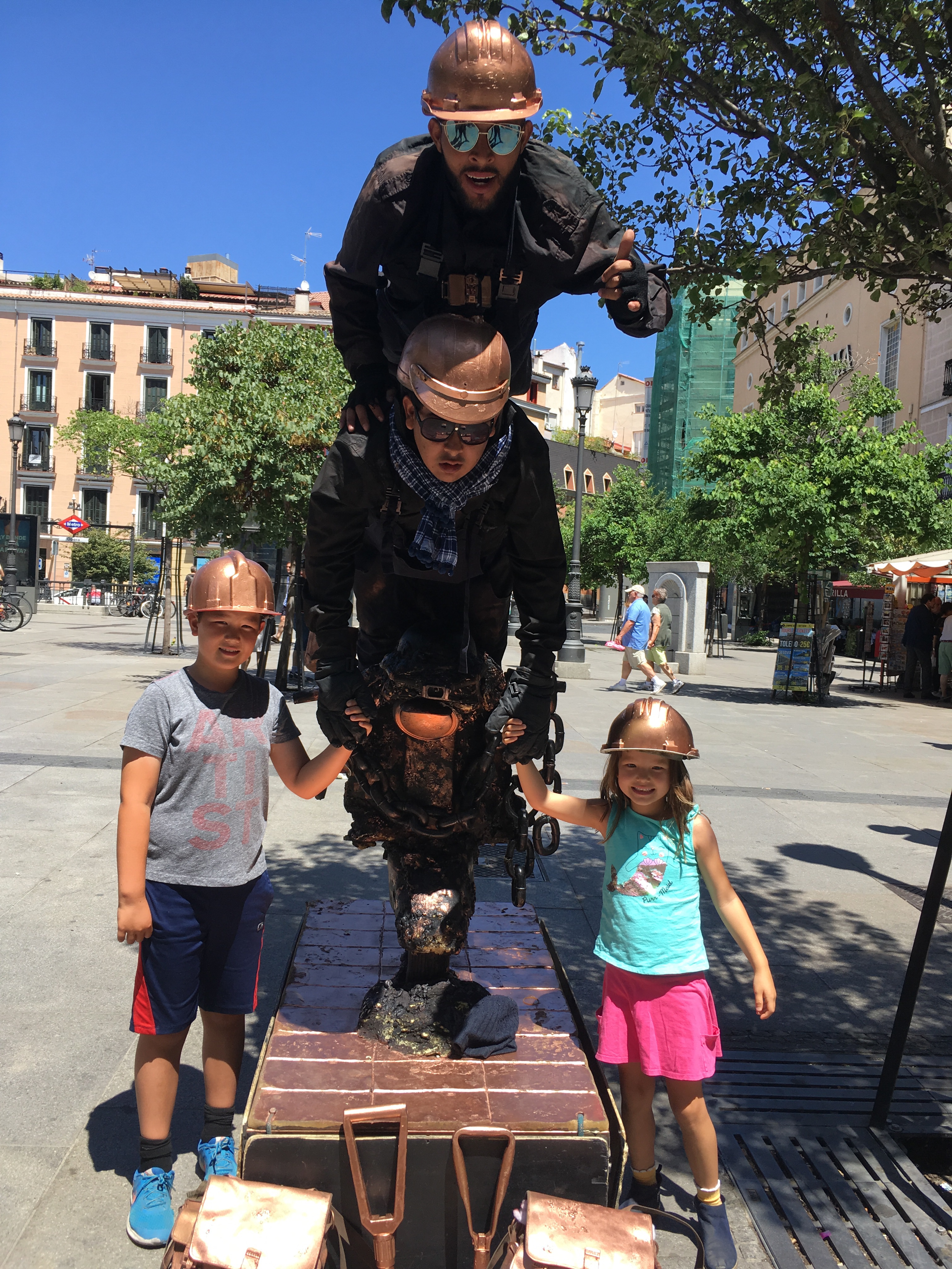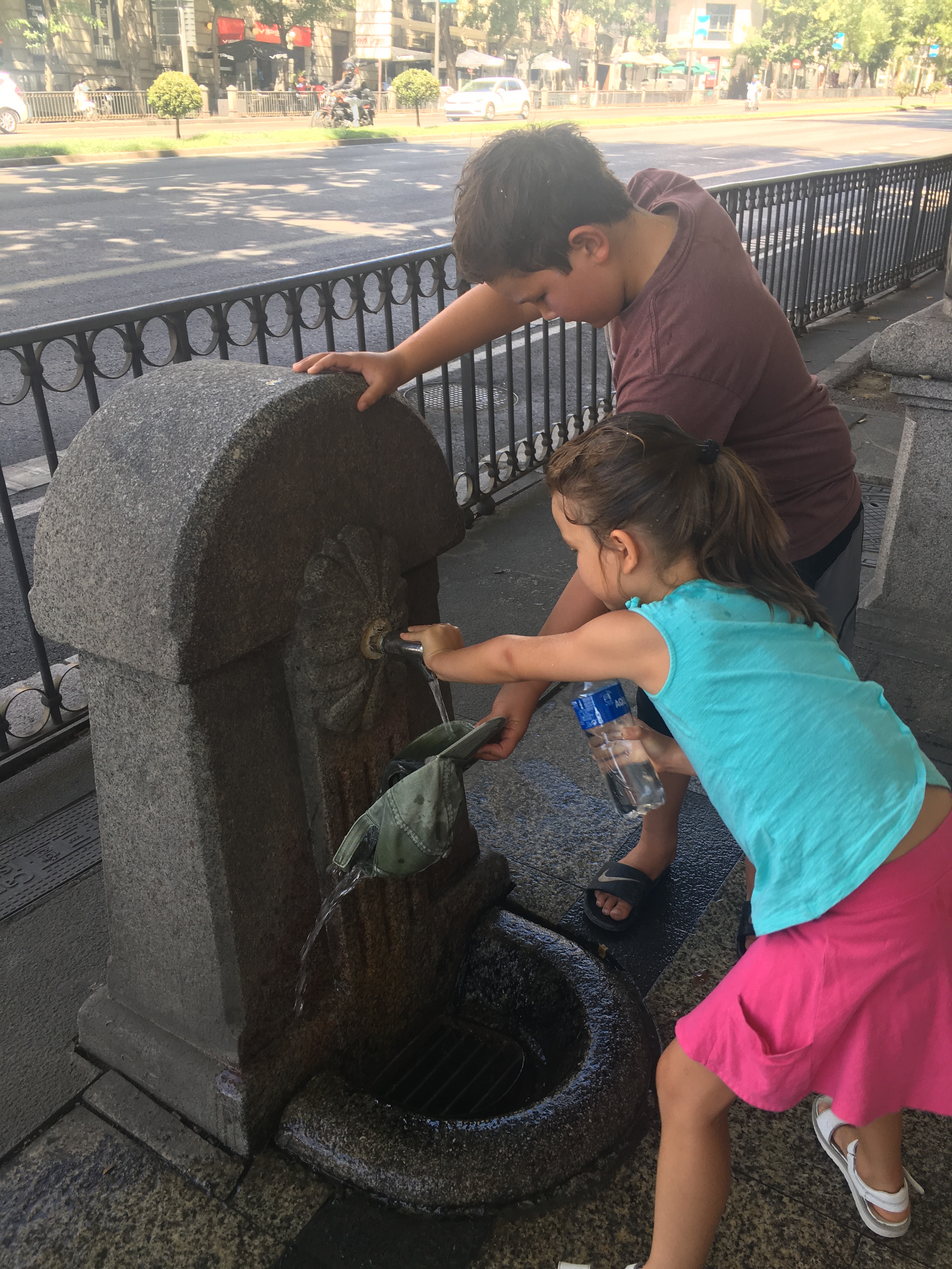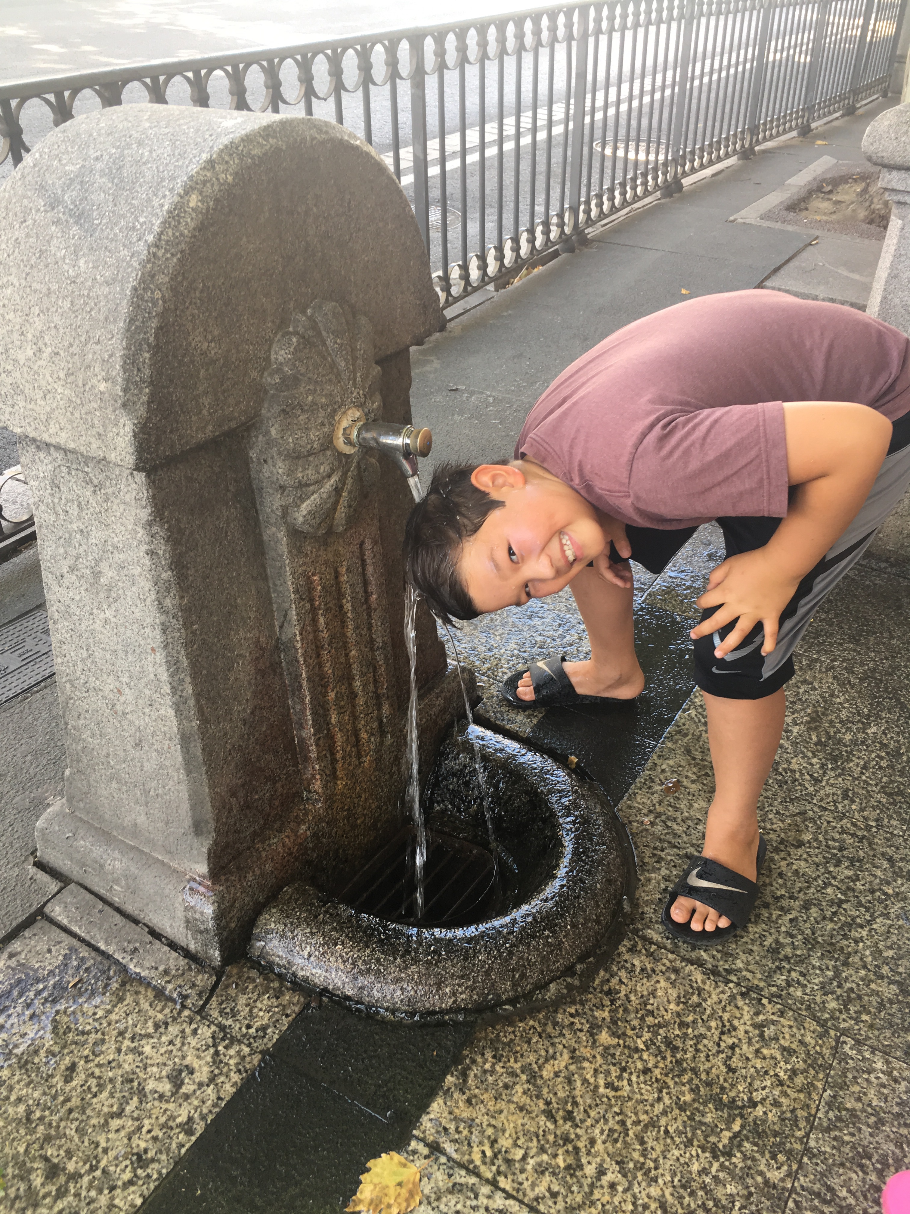Then a couple days later, Jett turned 10! We celebrated with birthday churros! Around the corner was a museum for kids that we decided to check out. It turns out that in Spain, instead of a tooth fairy, they have a tooth mouse named Raton Perez who has a bag for collecting children’s milk teeth which he uses to make magic! His house is in the museum and the kids all tried to find him. I don’t think anyone saw him, but they did hear his footsteps as he scurried away. Very cute! I’m glad the tooth fairy doesn’t have to fly all the way to Spain to collect Kaia’s loose tooth! Then we walked to Retiro Park for a scooter ride. It was a scorcher that day, over 100F, so Jett found a creative way to use one of the numerous water fountains in Madrid.